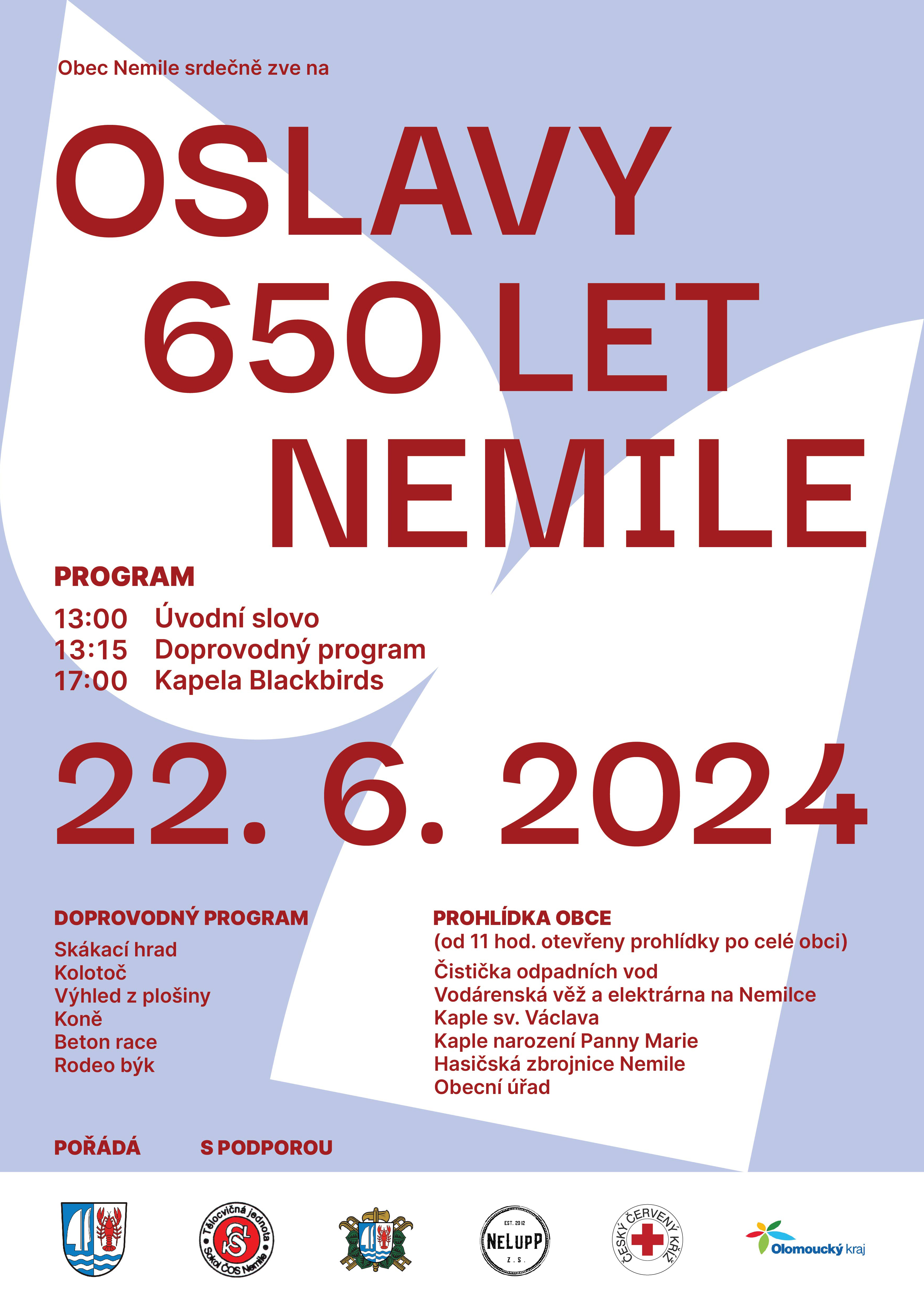 Moravská Sázava a radlice jsou ústředním motivem plakátu. Tyto symboly jsou odvozeny z obecního znaku Nemile a stávají se tak historickým spojníkem pro oslavy 650 let obce.