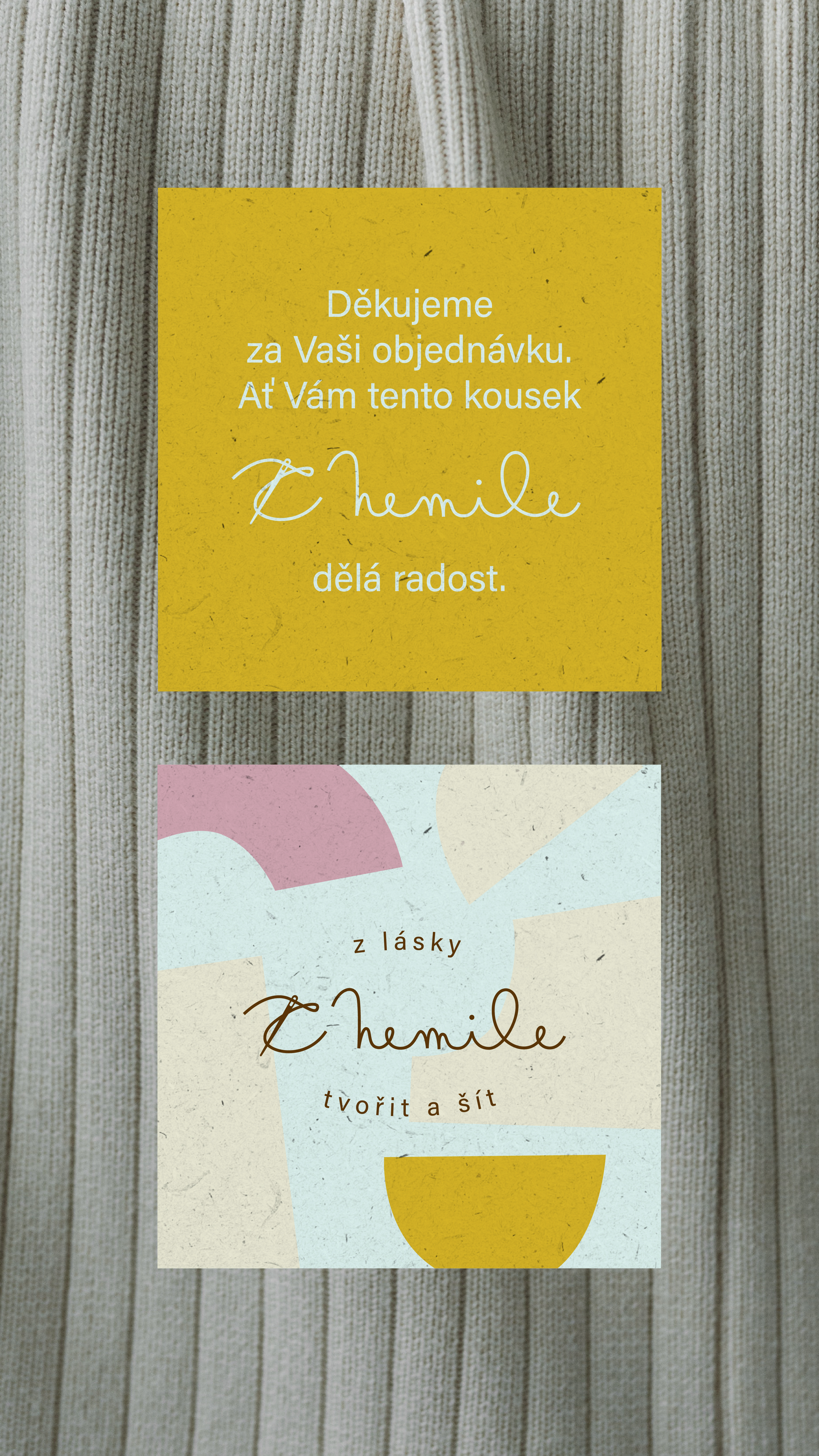 Tenhle vizuální “starter pack” jsem nadělila mamce k tomu, aby mohla se světem sdílet svoji lásku k šití. Její jméno je Zorka, proto niť proplétá jehlu do tvaru písmene “Z”. A jelikož se všechno tvoří u nás v malé vesničce, vznikl tak název Z Nemile.